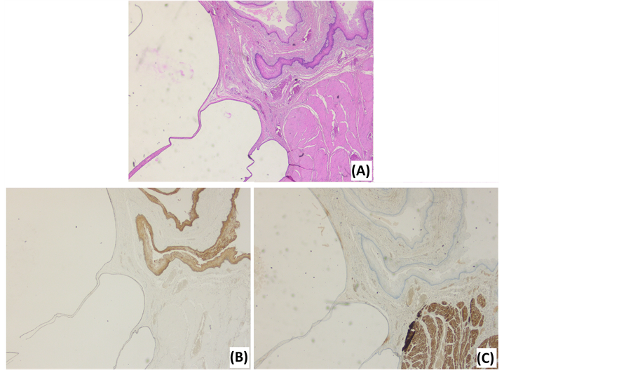 Figure 4. Photomicrographs of a tailgut cyst. (A) HE stain illustrates the multilocular aspect, various epithelial types and a disorganized muscle layer. (B) Cytokeratin 5/6 stain illustrates the epithelial tissues. (C) Desmin stain illustrates the disorganized, interrupted muscle layer.