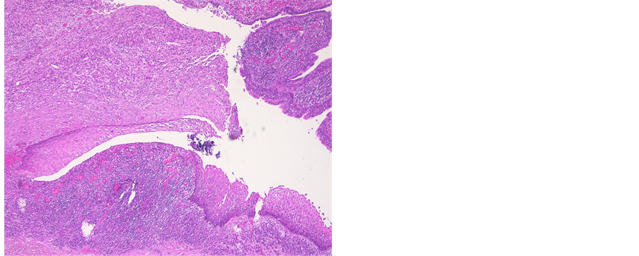 Figure 5. Photomicrograph of an epidermoid cyst. HE stain illustrates a malpighian epithelium with a granular layer. Inflammatory response due to rupture of the cyst.