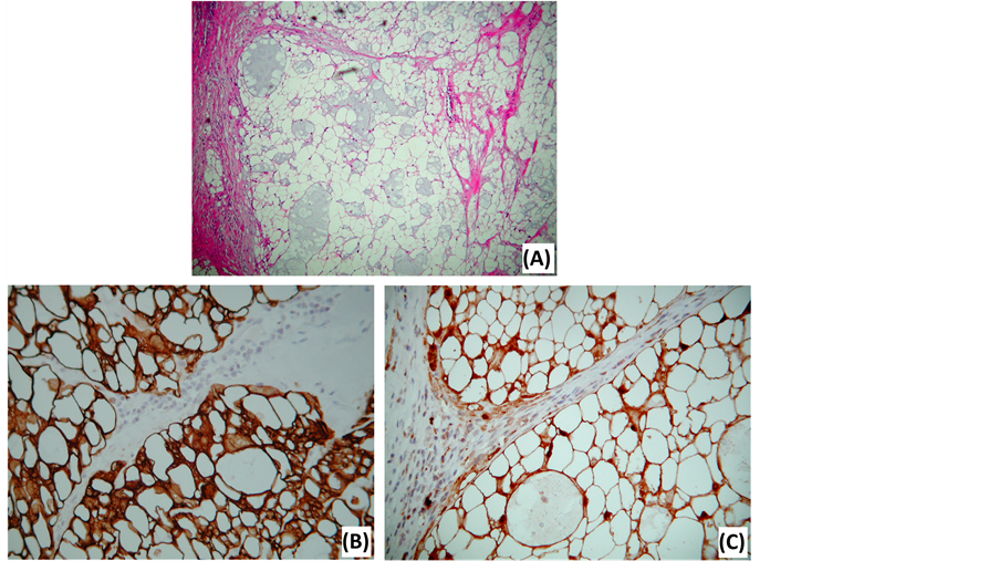 Figure 6. Photomicrographs of a chordoma. (A) HE stain illustrates the typical physaliphorous cells, containing numerous, variably sized, intracytoplasmic vacuoles. (B) Keratin stain. (C) S-100 protein stain.