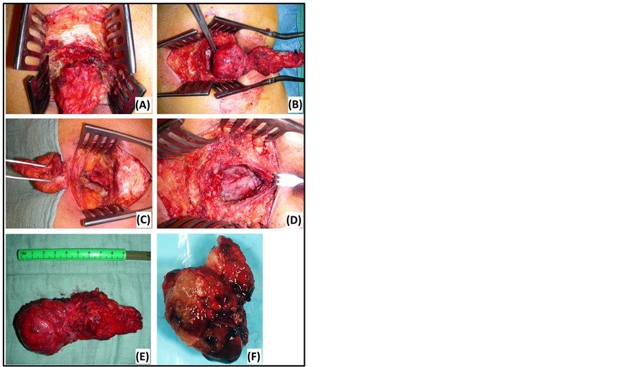Figure 1. Kraske’s transsacral approach. (A) Partial sacrectomy at the level of S5. (D) Closure in layers. (B) En bloc resection of a tailgut cyst. (E) Tailgut cyst: macroscopic view. (C) Residual defect after resection of an epidermoid cyst. (F) Chordoma: macroscopic view.