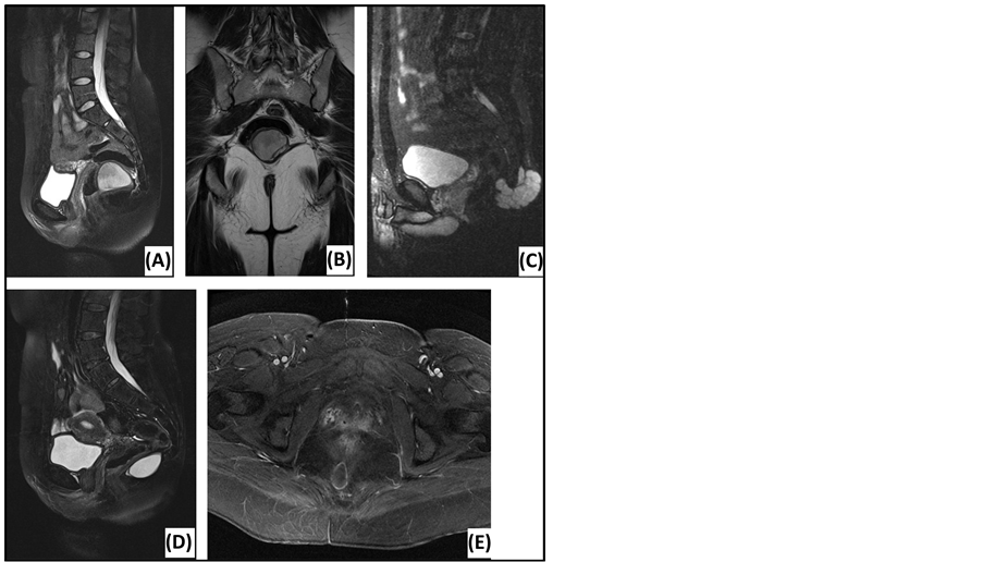 Figure 2. Magnetic resonance imaging of presacral lesions. (A) Sagittal T2-weighted MRI of a tailgut cyst: located below S3, sharp tumor margins, high signal intensity, homogeneous, unilocular. (B) Coronal T2-weighted MRI of a tailgut cyst: external compression of the rectum. (C) Sagittal T2-weighted MRI of a chordoma: located below S3, extension behind the sacrum, sharp tumor margins, high signal intensity, homogeneous, multiple septations. (D) Sagittal T2-weighted MRI of an epidermoid cyst: located below S3, sharp tumor margins, high signal intensity, homogeneous. (E) Axial T1-weighted MRI of an epidermoid cyst: Gadolinium enhancement in the wall of the lesion.