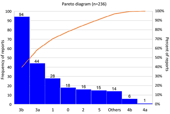 Table 2 shows the breakdown of the 236 incidents. Figure 1 shows a Pareto diagram of the incident levels, which displays the frequency of reports and percent of reports by the level of the incidents. The influence levels were summarized as follows: level 0: 18; level 1: 28; level 2: 16; level 3a: 44; level 3b: 94; level 4a:1; level 4b: 6; and level 5: 15, and others: 14. As the most often surgeon-reported incidents, the first place was the level of 3b (39.8%) and the second was the level of 3a (18.6%).The incidents classified by a higher degree than that of level 3b were about half of the total (49.2%), which means better medical treatment and care for severe injuries.