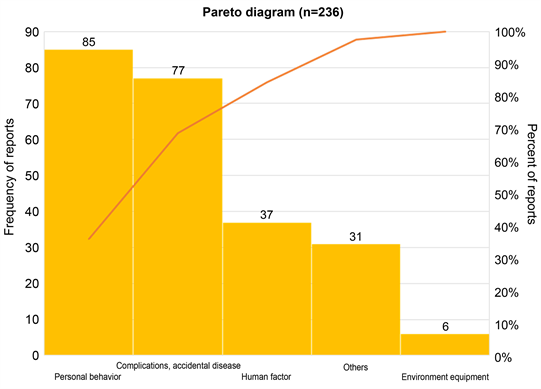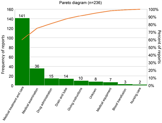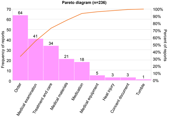 Table 3 shows the profile of the incidents. Figure 2 shows a Pareto diagram of the incident profiles. The first place was medical treatment and care (59.7%, 141/236), the second was medical examination (15.3%, 36/236), the next was
