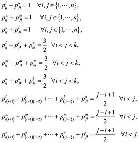 The statements presented in (1) are very important in the sense that they are used to construct the judgments matrices. Experts are invited to provide pair wise comparisons for a set of n − 1 preference values. In others terms, they must fill the questionnaire by providing answer for only n − 1 cells of the matrices and the values of the other cells are obtained by applying the statements in (1) in order to obtain an additive reciprocal consistency matrices. After construction of the preference matrices, in order to preserve the reciprocity and additive consistency, scholars [10] suggest to apply the function written below to transform the judgments values in case the pair wise comparisons matrices obtained, have values included in the interval