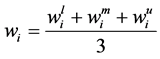 Finally, the fuzzy weight obtained in Equation (4) is defuzzified using fuzzy mean method presented below: