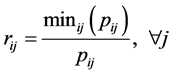 Step 8: Normalize the performance values. The performance values should be transformed into dimensionless units and the criteria compared to each other. According to the same authors, the following normalization formula has been applied: