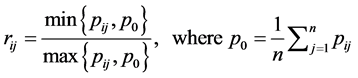 where gi is the mean of the comparison values of row i and is computed as follows:
