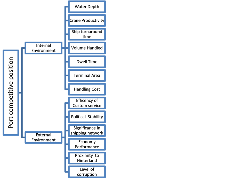 The review of the studies related to port choice criteria provides substantial information about the key findings in different geographical area. Furthermore, the review of the literature shows that past studies investigating the determinants of port competitiveness consider the factors that are important to port users when choosing a port of call. In others terms, these studies have focused on port selection criteria. A number of studies on port selection criteria have used various methods revealing varying factors affecting the perception of shipping lines in their decision to call at a specific port. For instance, in the Western context, researchers [15] found that cost, hinterland connections, capacity, reliability, port location and cargo base had an influence on port selection while customer service qualities, location in port, total door-to-door transport time and feeder frequency were of low importance. Another study conducted by [16] confirmed the importance of hinterland connections and cost from shipping lines perspective and identified immediacy of consumers and feeder connectivity as also key determinants. In the Asian context, amount of cargo loading and unloading and cost were the key factors affecting shipping liners’ satisfaction for container terminal in the research conducted by [17] . Similarly an investigation by [18] identified that cost, hinterland condition are important from the perspective of shipping lines as in the studies conducted by [15] in the western context. Moreover, they indicated that port service, availability, convenience, logistics cost, regional centre and connectivity also influenced port competitiveness in the region. Researchers [19] determined that adequacy of port facilities, service flexibility in meeting customer’s special needs, navigation costs and cargo handling costs and availability of information systems were the most important determinants of port choice whereas the study conducted by [20] revealed that local cargo volume, terminal handling charge, berth availability, port location, and transshipment volume and feeder network were key factors. A study by [21] highlighted that cost, customs and government regulation, hinterland connections and terminal by order of importance operators were significant attributes of port competitiveness. Conversely, shipping lines calling at West African ports pay much attention on port infrastructure, port draught, political stability, market size/cargo volume, and international networks respectively [22] . In South Africa, cargo profitability, draft, inland intermodal services, transshipment cargo volume, geographical location, berth availability and information technology ability have been found as having an influence on port choice decision [23] . Besides the factors mentioned above, some researchers identified some external variables affecting port competitiveness. For instance, scholars [24] demonstrated that in addition to port infrastructure endowment, factors such as corruption level, internet users, economy performance of port host country, liner shipping connectivity index and piracy attack may have an influence on port attractiveness and thus port competitive position. Furthermore, a research by [25] indicated that there is a positive relationship between container port competitiveness and the volume of traffic. According to the same researchers, container port competitiveness depends to their internal quality and external environments.
