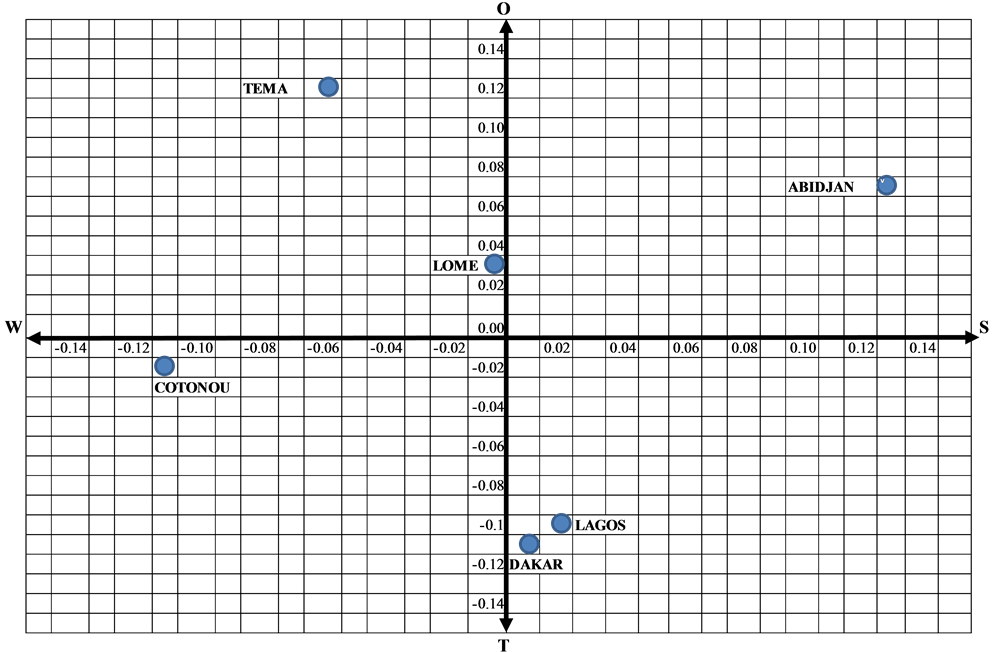 The results imply that compared to Abidjan and the four others port, Tema enjoyed the best opportunities for development. In order to identify the competitive position of the ports, their coordinate values are plotted in the quadrant of the grand strategy matrix as described in Figure 2. The analysis of Figure 2 reveals that Abidjan with its substantial