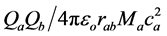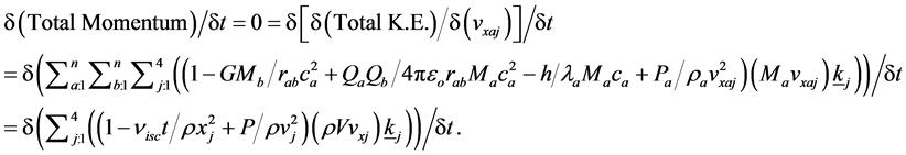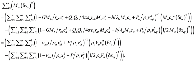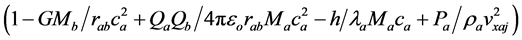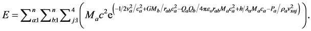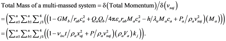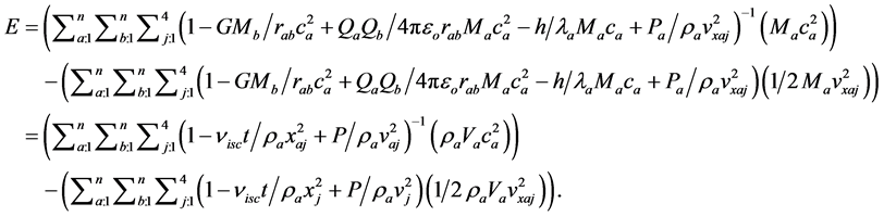 c = velocity of light, ρ = density, ?= energy density, e = exponential, E = energy, F = force, kT = kinetic energy, h = Planck’s constant, i = (−1)1/2, k = constant, M = mass at velocity v, Ma = mass a, Mo = mass at zero velocity, P = pressure, t = time, νisc = viscosity, δxa = change in xa, δt = change in time, va = velocity of Ma, π = pi, V = volume, Nm = number of molecules, G = gravitational constant, rab = radius between a and b, Qa = charge on a, Qb = charge on b, λa = wavelength of a,