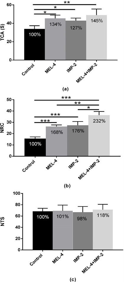 As for TCA, NRC parameter is also increased by the MEL, IMP and two associated molecules with comparison to the control group [(control/MEL-4: p < 0.001); (control/IMP-2: p < 0.001); (control/MEL-4 + IMP-2: p < 0.001)]. Similar results were obtained by referring to relative comparison (NRC% BL) between