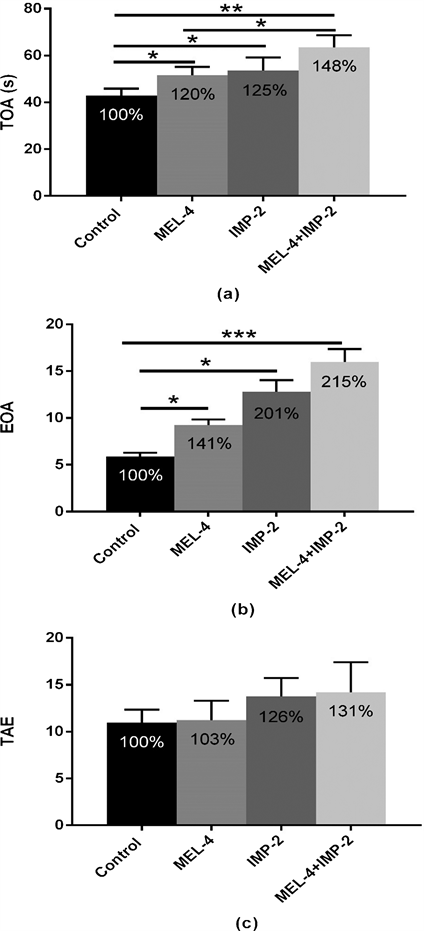 Neither MEL nor IMP or two associated molecules induced a significant effect on the TEA parameter [(control/MEL-4: p > 0.05); (control/IMP-2: p > 0.05)