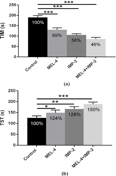 In the FST, MEL, IMP and combined molecules strongly and significantly reduce the TIM [(control/MEL-4: p < 0.01); (control/IMP-2: p < 0.001); (control/MEL-4 + IMP-2: p < 0.001)]. MEL, IMP and (ML + IMP) induced a mean reduction of TIM of 31% (p < 0.01), 44% (p < 0.001) and 54% (p < 0.001) respectively.
