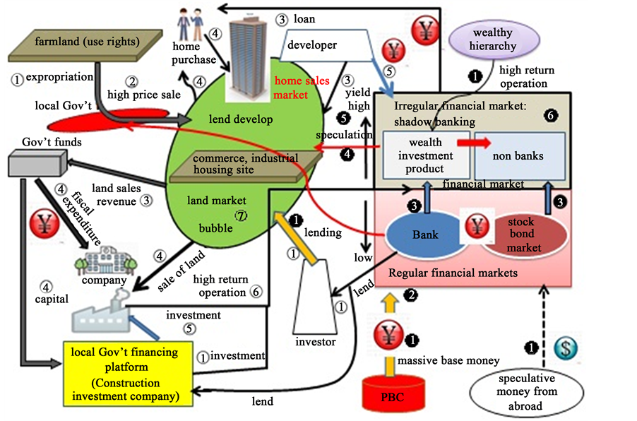 Pathway A: 1) The local government expropriates farmland from farmers. 2) The local government sells the land to developers. 3) The local government takes huge money. 4) The local government invests huge amounts of money to their institution, namely local government financing platform. 5) The local government financing platform invests in some local business operations and 6) shadow banking. 7) The land and housing markets expand and steps 1) ⇒ 2) ⇒ 3) are repeated. The developer develops the land and builds houses, and house buyers borrow money from banks to pay. Some buyers borrow money from non-banking institutions. 4) The developer sells the houses to buyers. 5) The developer invests in irregular financial market (shadow banking field).