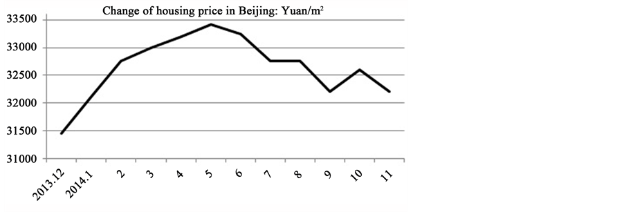 There are three groups in which the average price/m2 of a house in Beijing is divided in Nov. 2014 (see Figure 9). The first group is less than 10,000 Yuan/m2. The second is 20,000 - 30,000 Yuan/m2, and the third is 40,000 Yuan or more/m2. The third group, 40,000 Yuan or more/m2, should be divided to 60,000 - 70,000 Yuan/m2,