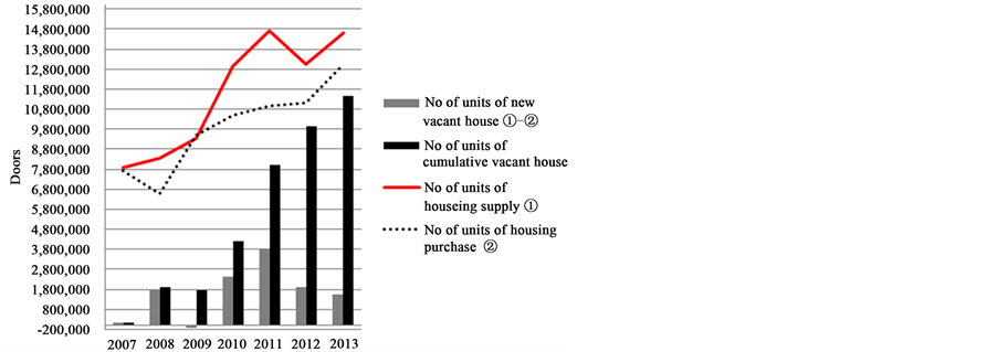 Under the trend of investment by developers and the local governments, the number of unsold houses as a whole does not stop the development of the country. Figure 10 shows the detailed situation of the trend, namely the number of units of cumulative unsold houses in China is rapidly increasing. The number of units of cumulative unsold houses had reached 11 million 473 thousand in 2013. Southwest University of Finance and Economics in Sichuan province has estimated more than 50 million new houses in China are unsold.