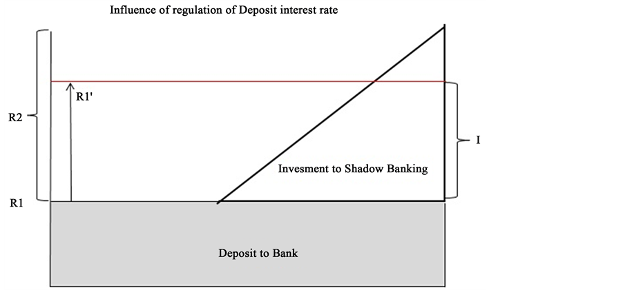 The problem will occur when official deposit interest rate is deregulated in the near future. When the rate (R1) goes up by R1’, the part of investment in shadow banking (mark I) should transfer to bank deposit field. If that happens, shadow banking will face collapse. So we can say that the trigger of collapse comes from the regulation of interest rate policy. The president of PCB, Mr. Zhou Xiaochuan, has announced that PCB will deregulate the deposit interest rate within two years. If PCB deregulated not only the lending interest rate but also the deposit rate simultaneously in July 2014, a concern like this would not appear. This is the big mistake made by PCB.