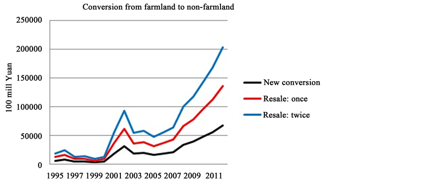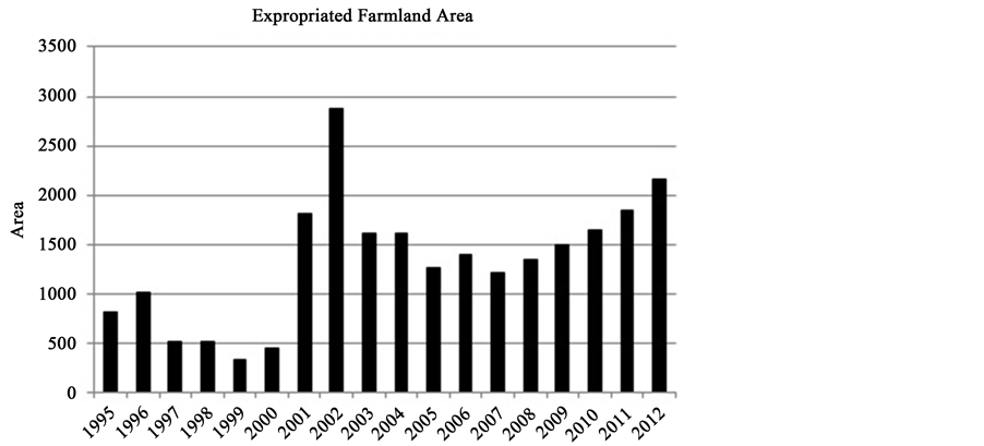 Farmers do not have ownership of farmland, so a farmland may be expropriated by local governments with small compensation given to farmers. Then the land could be sold to someone and be used outside of agricultural purposes. The price of farmland is zero, but if one piece of the same land is sold for the purpose of non-agri- cultural usage, then the land immediately appreciates in value. In the case of selling a piece of land in a huge city, a piece of land is sold for several ten thousand Yuan or more per one square meter. On the other hand, a piece of farmland has no market price mechanism, but when the same land is converted to be used for non- agricultural purposes, that same land gets into the market price mechanism. Through this mechanism, huge money will flow into the local governments first, after that the money moves to financial shadow banking market and real estate market. The area of farmland expropriated for about 20 years from 1995 to 2012, which is the same as the area of conversion to non-agricultural usage, is shown in Figure 1. According to this figure, the area began abruptly increasing since 2001. At about the same time, the Chinese economy encountered a bubble situation. The expropriated average land area per year is about 1500 km2, and the amount has reached to 1,922,533 km2 after about 20 years.