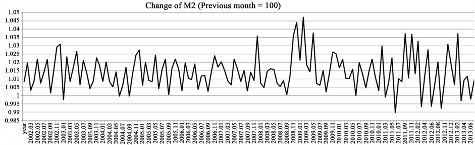 Furthermore, this can be verified from a financial point of view as shown in Figure 4. Figure 4 shows the monthly curb of M2 from 2002 to 2014. The index is increasing by the month, and the fluctuation range is 0.998 to 1.045. The trend is divided for two periods or stages, from 2002 to 2008 and 2009 to 2014. The fluctuation range of the former is 1.005 to 1.030, and the latter is 0.998 to 1.045. The range of 2002 to 2008 is smaller than the period of 2009 to 2014. The latter period is more unstable than the former, which suggests that Riemann shock allowed the Chinese bubble economy to become more unstable with regard to the financial market. This means the Chinese economy needs much of M2 because the growth of GDP became moderate and the growth rate of GDP began to slow down to a level of 7% from 10% after the Riemann shock. Money is also overflowing in the real economy and financial market since the Chinese government supplied 4 trillion Yuan to support the private sector.