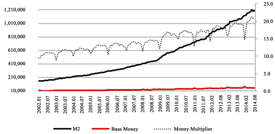 The fact of money multiplier, shown in Figure 5, which counts more than 20 times over, is one of the bigger characteristic of China. This index is around 10 times that of USA and EU countries and Japan (Takahashi, 2013) . As seen above, M2 of China is increasing rapidly, and this speed is highest in the world economy. As a