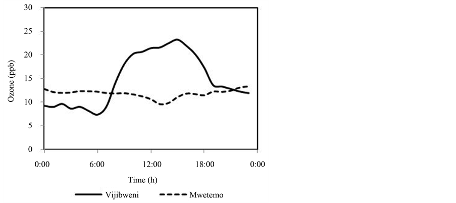 Ozone concentrations in the urban Dar es Salaam sites were generally higher than concentrations in Bagamoyo, a rural site. Figure 6 shows the mean hourly concentrations in Bagamoyo (Mwetemo village) and Dar es Salaam (Vijibweni). The mean hourly concentrations in Dar es Salaam were 10 - 30 ppb, while in Bagamoyo they were 9 - 15 ppb. We observed strong diurnal variation in Dar es Salaam, while Bagamoyo showed little variation. This may be because Dar es Salaam is more polluted with higher levels of NOx than Bagamoyo (see Table 3). Bagamoyo is more remote and NOx concentrations were very low. Ozone might also be photochemically destroyed in the free troposphere under low NOx conditions [33] . Being 45 km from the sea, clean air from the Indian Ocean travels to the Mwetemo village. These results agree with those observed by others [32] [34] .