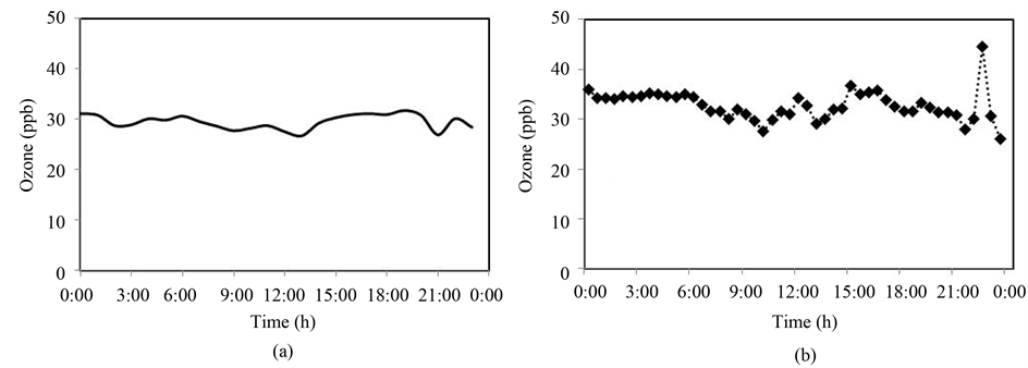 Figure 7. (a) Mean hourly ozone concentrations in January; (b) mean hourly ozone concentrations on January 19, 2014 in Vijibweni, Dar es Salaam.