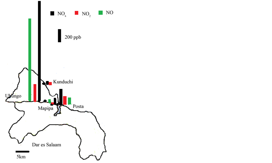 from this study. Our O3 results for Dar es Salam are similar to those of Lacaux et al. [41] Jonnalagadda et al. [42] and Augustine [43] in Zimbabwe, Central Africa, and Port Harcourt, Nigeria, respectively. Among the limited NOx data, Odhiambo et al. [44] reported high NO2 concentrations of 976 ppb in Nairobi. The increased nitrogen oxide concentrations could increase O3 concentrations through photochemical reactions in remote areas; thus, air quality studies are required within the city and in remote areas where most agricultural crops are produced.