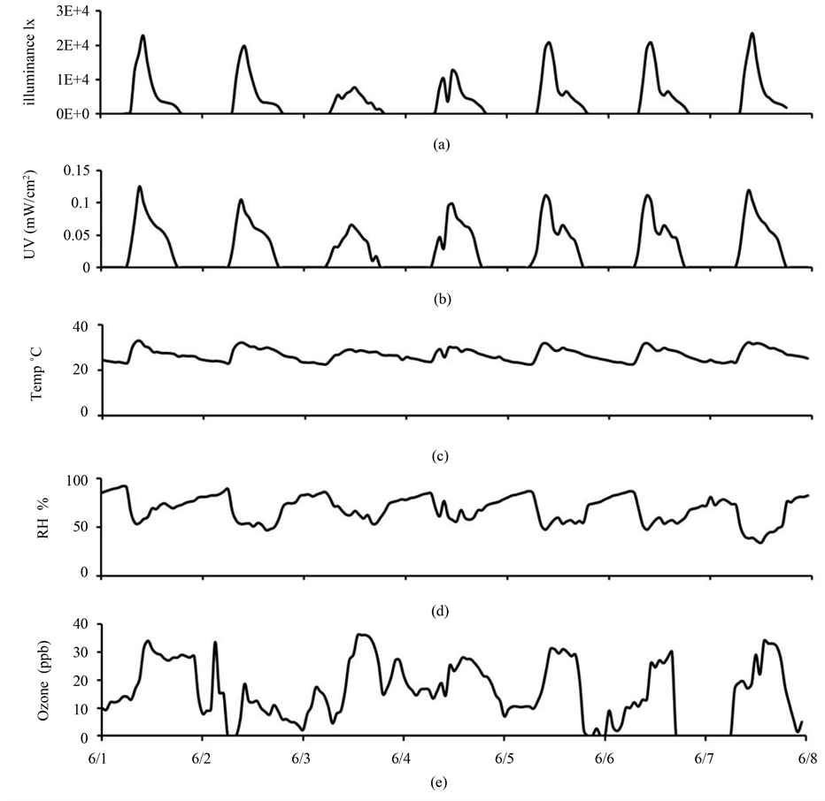 Figure 10. Time series data of daily mean ozone concentrations and meteorological parameters in Kunduchi in June 2013. Figures 10(a)-(e) show daily average illuminance, UV light, temperature, relative humidity, and ozone, respectively.
