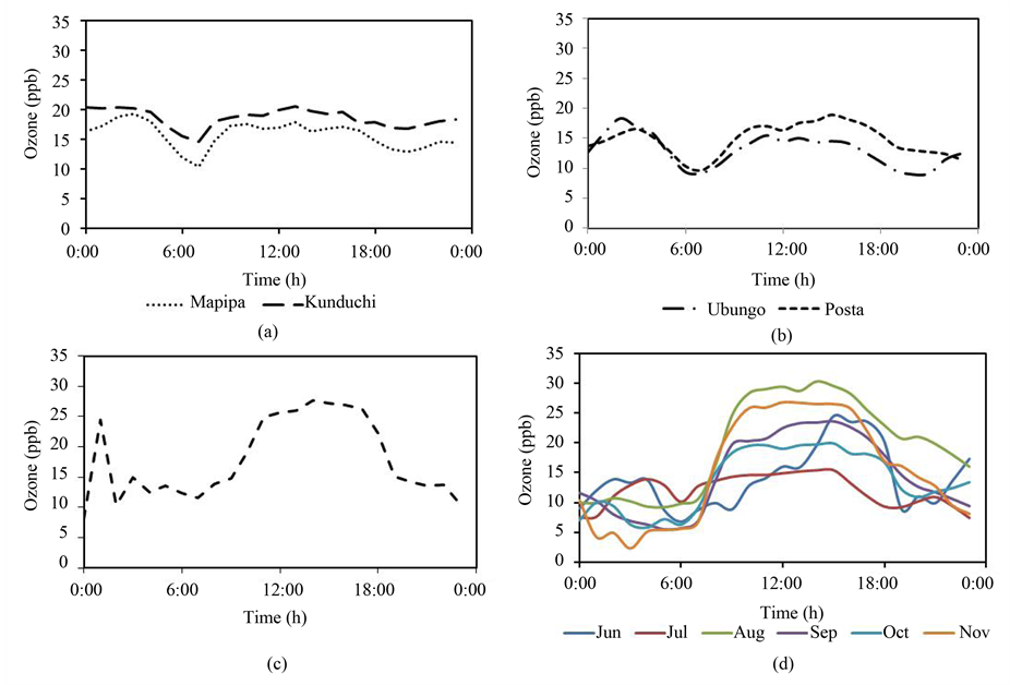 Figure 2. Daily variation of O3 concentrations in Dar es Salaam: (a) Kunduchi and Mapipa sites (February 2012); (b) Posta and Ubungo sites (June 2013); (c) Kunduchi site (June 2013); and (d) Vijibweni site (June-November 2014).