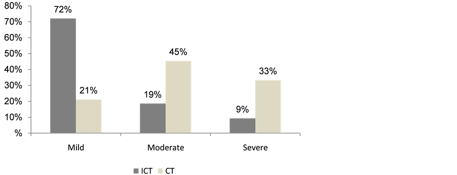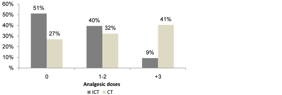 During the first 24 hours postoperative, 67.4% in the ICT group, and 94.6% in the CT group suffered pain, according to parents’ report (p < 0.001). Mild pain complaints during the first 3 postoperative days were 64.5% in the ICT and 28.3% in the CT group. In the ICT group, 72% of the parents rated their children’s 7 days postoperative pain as mild, compared with 21% in the CT group; 9% and 33% reported severe pain following ICT and CT respectively (Figure 1). Fewer than half (49%) of children in the ICT group needed analgesics, compared with 73% in the CT group (p < 0.05). Of those who used analgesics, a higher proportion in the CT group received 3 or more doses (Figure 2).
