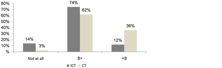 No intraoperative or postoperative complications were observed in the ICT group, compared to 13.5% minor complications in the CT group, most of them dehydration (p = 0.01).