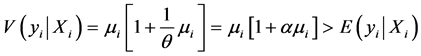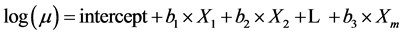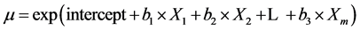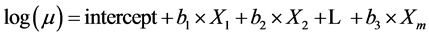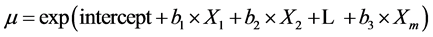 a significant problem in the Poisson model. The Poisson distribution is a special case of the negative binomial distribution, where the mean approximates the standard deviation [24] . We assumed that the log of the mean, m, was a linear function of independent variables,