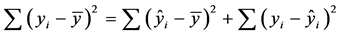 SSM + SSE, where SS was notation for sum of squares and T, M, and E were the notation for total, model, and error, respectively. The square of the sample correlation was equal to the ratio of the estimates while the sum of squares was related to the total sum of squares: r² = SSM/SST. This formalized the interpretation of R2 as explaining the fraction of variability in the sampled An. arabiensis aquatic habitat data explained by the regression