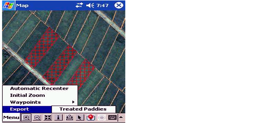 Vector map layers of rice fields were outlined as polygons, using ESRI shape files and MapInfo tab-file formats. By tapping on the PDA screen of a rice paddy polygon layer in the Karima study site, the end user had the ability to toggle a particular polygon as ON/OFF or TREATED/NOT TREATED, by changing the polygon line color, fill pattern, or both. The Recon X® supported both the raster image layer display and a vector-based data layer used for mapping rice paddy polygons. There was a minimal requirement to be able to output a simple text file of information indicating the paddy had been treated versus not treated (Figure 3). Spatial data sets consisting of a raster image layer and vector line work describing the QuickBird polygons were stored and displayed on the Recon X®. When uploaded into a Recon X, the polygons displayed all treated and untreated paddies within a 1 km buffer of the study site.