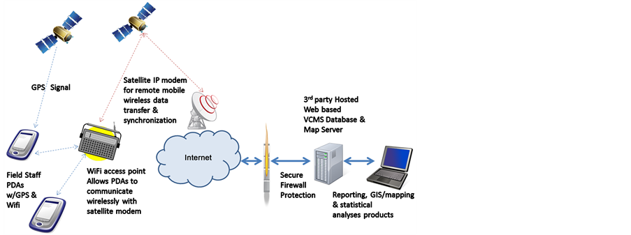 While time series web-based reporting systems within PDA-GIS-DGPS-RS cyber-environment are becoming more common in public health for disease surveillance and for tracking interventions such as field sampled An. arabiensis aquatic habitat data, their use for program evaluation is relatively new. Alternatively, a broadband satellite access point could be employed to wirelessly link multiple mobile field data collection devices to a server, via the Field Bridge middleware software. For example, Hughes Network Systems’ (HNS) 9201 Broadband Satellite IP Modem and Wi-Fi Access Point can be utilized as part of the field data communications within a robust PDA-GIS-DGPS-RS architecture for data transfer of seasonal-sampled field and/or remote An. arabiensis aquatic larval habitat endemic transmission oriented data to any Internet connected, back-end VCMS database server. The HNS9201 can support multiple field teams to simultaneously send and receive IP packet data of sampled An. arabiensis aquatic habitat data in PDA-GIS-DGPS-RS cyber-environment via USB, Ethernet, ISDN and Wi-Fi interfaces, using the Inmarsat BGAN satellite network and the Recon X® (Figure 4). This type of satellite link can provide 432 kbps IP data (transmit and receive) capability, Integrated Services Digital Network (ISDN) voice (4kbps) ISDN data (64 kbps) and Wi-Fi access point with multi-user capability. Firewall protection and data encryption techniques (e.g., 128 bit Advanced Encryption Standard (AES) Encryption) can prevent hackers from accessing the sampled field/remote endemic transmission oriented data, while firewall and password protection/encryption measures, at the database level can protect the transmission and storage of sampled An. arabiensis aquatic habitat data PDA-GIS-DGPS-RS cyber-environment. All the data managed by such a remote surveillance system can be spatially displayed via the use of GIS software, both as an embedded component of the VCMS database, or in a standalone desktop GIS using industry standard shape files. Traditional shapefiles contain cryptic field names, no rendering information and no metadata [5] .