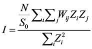 Global spatial autocorrelation is a measure of the overall clustering of the data [2] . One of the statistics used to evaluate global spatial autocorrelation is Moran’s I, defined by: