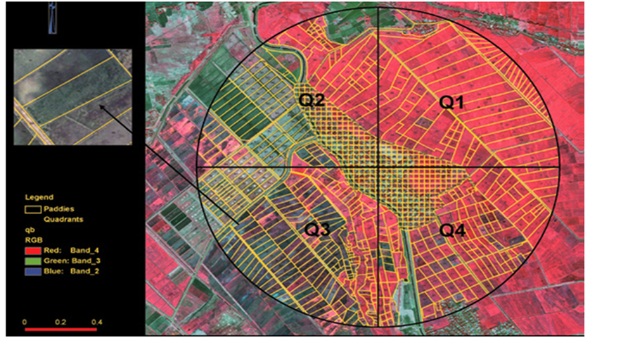 All QuickBird polygons generated were conformed to larval habitat boundaries within the 1 km buffer of the study site. Multiple data layers of spatial and attribute data were created, using different coded values for various rice field attributes, which were linked to the same grid cell. This digitized grid-based algorithm allowed retrie-
