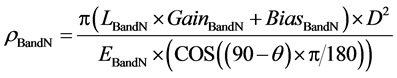 The NDVI is a simple graphical indicator that can be used to analyze remote measurements, typically but not necessarily from a space platform, and assess whether the target being observed contains live green vegetation or not [1] . Leaf cells have also evolved to scatter solar radiation in the NIR spectral region (which carries approximately half of the total incoming solar energy), because the energy level per photon in that domain (wavelengths longer than about 700 nanometers) is not sufficient to be useful to synthesize organic molecules. Although electromagnetic waves have wavelengths that range from 1 nanometer (nm) (10−9 meter) for x-rays to 1 kilometer (103 meters) for radio waves wavelengths of visible light are in the range of 400 to 700 nanometers. Jacob et al. [2] employed the equation E = (hc)/L in a MapTP Mobile, web-based mapping applications where E was the energy of photon in a seasonal, vector, malarial, mosquito-related (e.g., Anopheles arabiensis s.s.), aquatic, larval, habitat, spectral, endmember, forecasting, predictive, epidemiological, risk model, h was the Planck’s constant, 6.626 × 10^−34 J·s, c was the speed of light, 2.998 × 10^8 m/s and L was wavelength for converting nanometers to units of joules (J), whereby, 715 nm = 7.15 × 10^−7 m and then E = (6.626 × 10^−34 J·s)*(2.998 × 10^8 m/s)/(7.15 × 10^−7 m) = 2.778 × 10^−19 J. The authors noted that live green plants associated with the seasonal-sampled Anopheles arabiensis s.s. aquatic larval habitats appeared relatively dark in the photosynthetically active radiation (PAR) and relatively bright in sub-meter resolution (panchromatic QuickBird 0.61 m resolution) NIR region of the electromagnetic spectrum. Photosynthetically active radiation designates the spectral range (wave band) of solar radiation from 400 to 700 nanometers that photosynthetic organisms are able to use in the process of photosynthesis [1] . PAR explanatory covariate coefficients were employed for constructing multiple, biophysical, seasonal, An. arabiensis s.s.-related, endemic, transmission-oriented, predictive, explanatory, eco-epidemiological risk models where the forecasted derivatives were quantified as µmol photons m−2∙s−1, a measure of the photosynthetic photon flux (area) density, or PPFD. The derivatives were also expressed as Einstein units (i.e., µE∙m−2∙s−1). PAR action spectrum, revealed absorption spectra for chlorophyll-A, chlorophyll-B, and carotenoids related to the sampled aquatic larval habitats. Differential reflection in the red and infrared (IR) bands enabled remotely monitoring density and intensity of green vegetation growth using the spectral reflectivity of solar radiation. By contrast, clouds tended to be rather bright in the red (as well as other visible wavelengths) for some of the imaged, georeferenced, (e.g., Anopheles arabiensis s.s.), aquatic, larval, habitat objects and quite dark in the NIR.