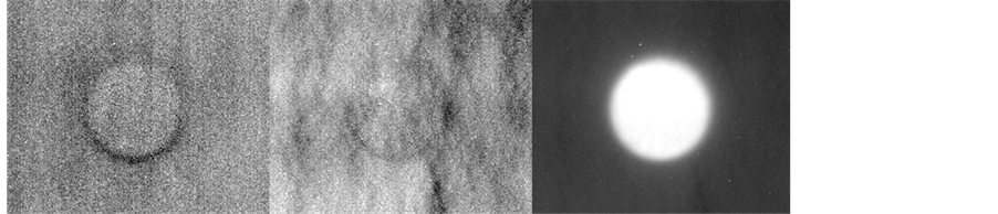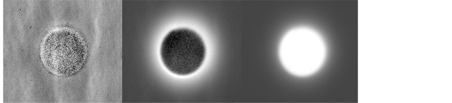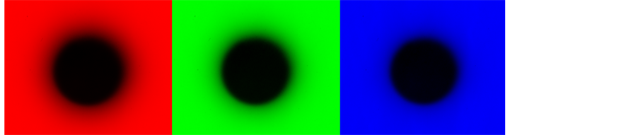 Figure 2. Red, green and blue channels (from left to right) of the central region of Figure 1. The faint irrgularity in the background of the blue channel reflects a slight nonuniformity in the thickness of the sensitive layer of the film, which is most visible in the blue channel be- cause the yellow dye most strongly absorbs blue light.