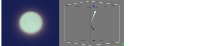 Figure 3. (Left) Full-color optical density image of a 63.7 Gy dose film; (Right) Trajectory in RGB color space of the pixels in the image to the left.