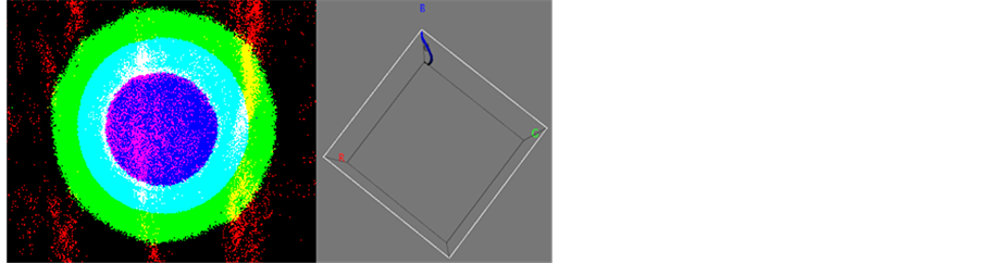 Figure 5. (Left) The three eigenimages of Figure 4 arbitrarily assigned to the red channel for the smallest eigenvalue, the green channel for the middling eigenvalue and the blue channel for the largest eigenvalue. The display has been adjusted to a low window level and a narrow width so that the colors are saturated. The transition from blue to green at the perimeter of the source demonstrates the dose-dependent color shift; (Right) The color space trajectory of the eigenimages with this arbitrary color assignment. Although these are the same data as in Figure 3 Right, after the principal component analysis, the pixels fall predominantly in the blue-green plane.