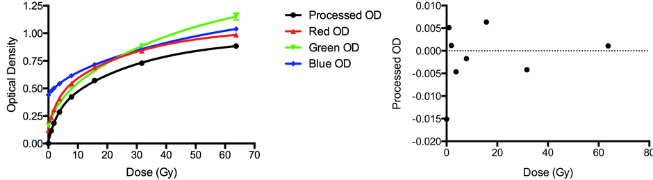Figure 7. Optical density vs. Dose. (Left) The optical densities (OD) of the red, green and blue channels are plotted in their respective colors. The processed optical density is plotted in black. The processed optical density curve was fit to obtain the transformation from dose to processed optical density given in Equation (6); (Right) Residuals of the fit.