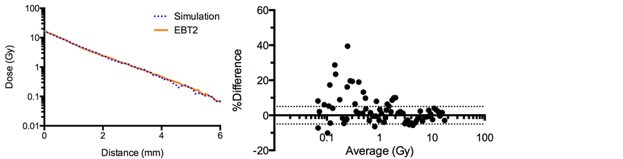 Figure 8. (Left) Comparison of the radiochromic film measurement of the dose (solid line) to the Monte Carlo simulation (broken line) as a function of distance along the central axis from the surface of a disk source of 148 MBq of Y-90; (Right) Bland-Altman plot of the percentage difference between the radiochromic film (minuend) and the Monte Carlo simu- lation (subtrahend). The horizontal axis is the average of the two values and logarithmic, thereby emphasizing the lower doses. The horizontal dotted lines represent plus and minus 5% differences.