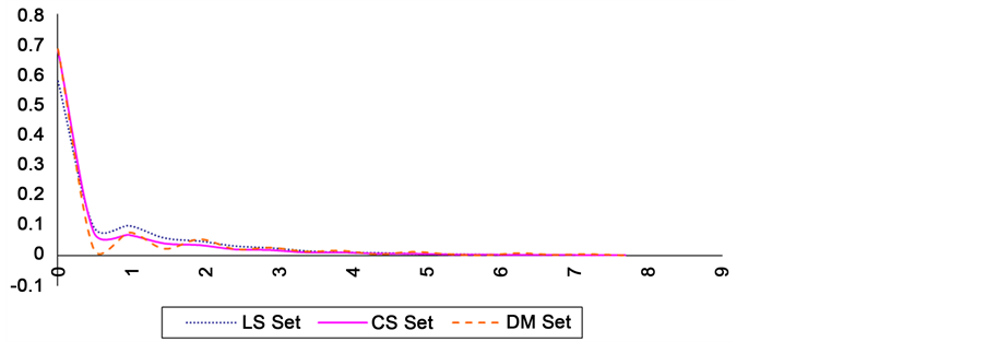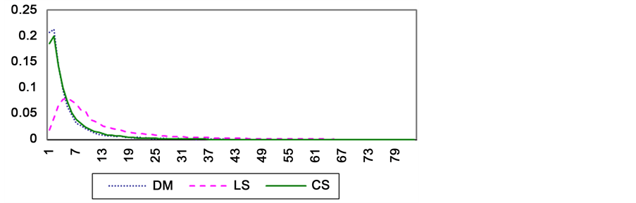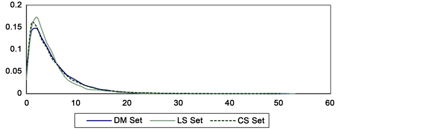 One bibliometric feature that may vary from discipline to another is the productivity level of authors. One possible indicator of productivity level of authors is publishing frequency curve. The publishing frequency curve of author A is defined as the distribution of time spans between A’s consecutive publications. The time span between consecutive publications P1 and P2 of author A is computed as the absolute difference of P1 and P2’s publication years. Short time spans between A’s publications is an indication of his productivity level. Figure 7 illustrates the frequency distribution of time spans in the three papers sets.