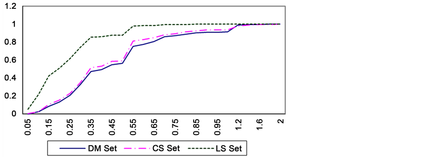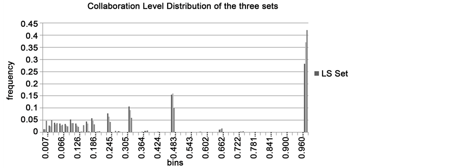 We may go further and define the Collaboration Level Distribution curve as shown in Figure 6. We may use this curve to check how abnormal the collaboration level between two authors in a particular discipline. Figure 6 shows the collaboration level distribution in the three paper sets.