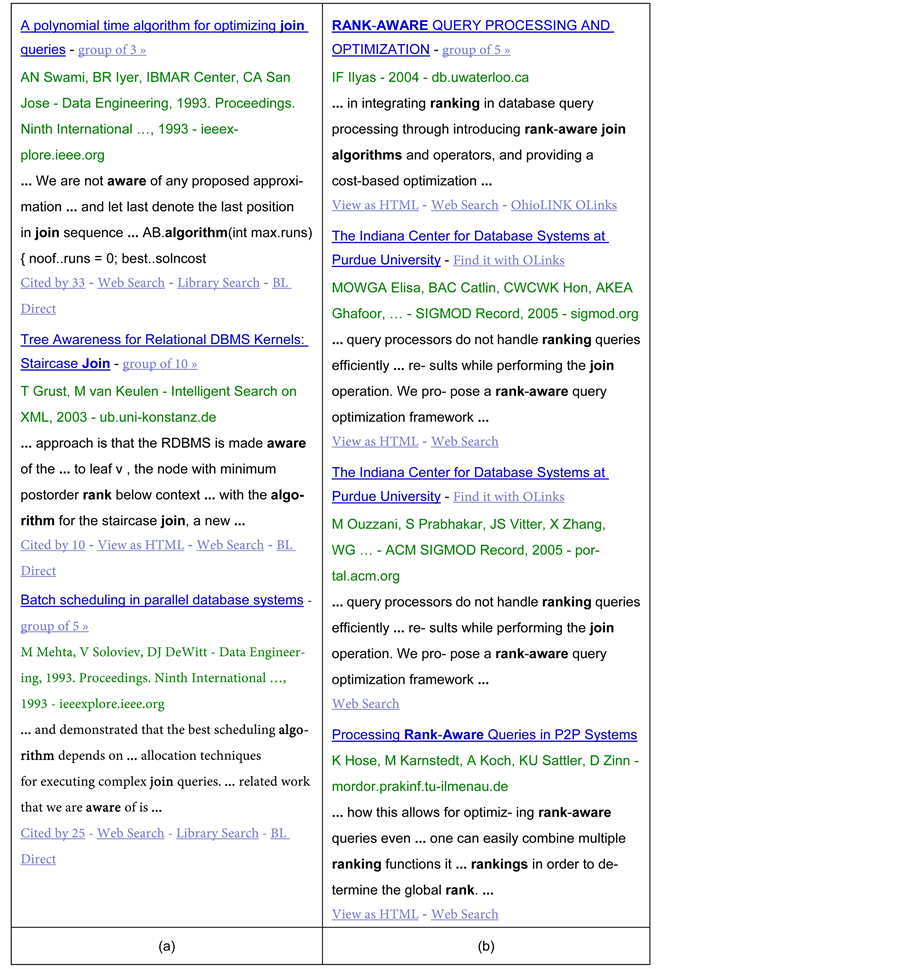 Figure 1. Searching Google Scholar for “rank aware join algorithms” (a) the first matches of the first page and (b) the first matches of the second page.