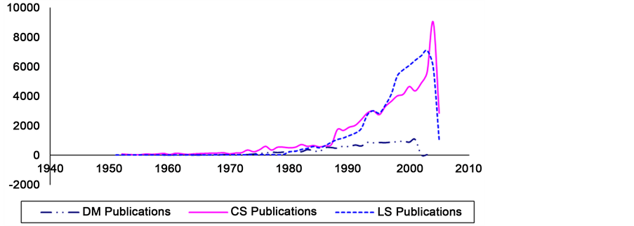Observation 1: the number of publications per year parameter is steadier in the DM field than in the CS and LS sets.