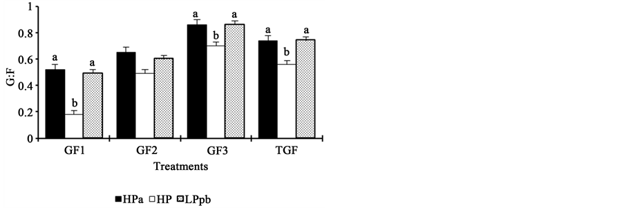 Piglets fed the HPa and LPpb diets showed similar performance parameters (P > 0.05) for all weeks and for the entire experimental period (Figure 2). In contrast, animals fed the HP diet had significantly poorer performance than the other two groups of animals (P < 0.05), except for ADFI during the first week postweaning and G:F during the second week postweaning.