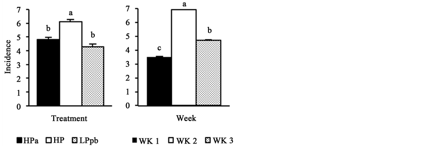 All animals had mild diarrhea throughout the experimental period (Figure 1). However, animals fed the HP diet had the highest incidence and severity of diarrhea (P < 0.01), while the other two groups (HPa and LPpb) exhibited similar incidence and severity. The highest incidence and severity of diarrhea were observed during the second week postweaning (P < 0.01). Both, incidence and severity of diarrhea, decreased during the third week postweaning (P < 0.01), returning to values similar to those observed during the first week postweaning.