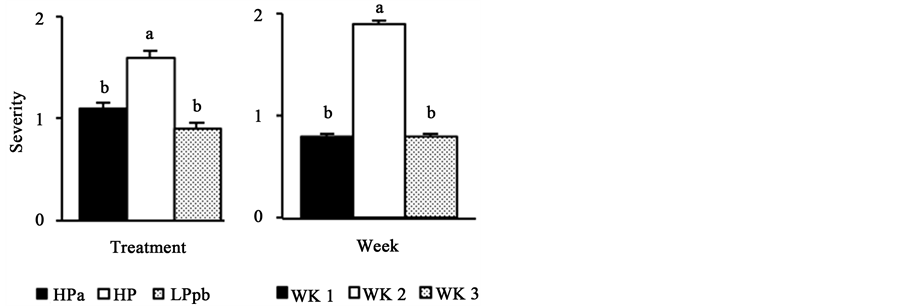 Figure 1. Effect of treatments and postweaning weeks on the incidence and severity of diarrhea. HPa: high-protein diet with antibiotics; HP: high-protein diet without antibiotics; LPpb: low-pro- tein diet without antibiotics and with probiotics; WK1: first week postweaning; WK2: second week postweaning; WK3: third week postweaning; abcbars with different letters show statistical differences (P < 0.01).